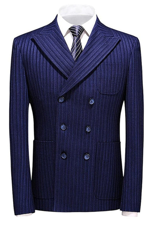 Chic Blue Double Breasted Striped Business Suits with Peaked Lapel Wedding Suits Two Pieces Tuxedos