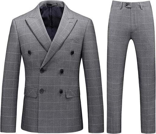 Button:Double BreastedOccasion:Prom, Business, WeddingNeckline:Peaked LapelMaterial:Polyester BlendPattern:PlaidPiece:2 PiecePocket:With Flap