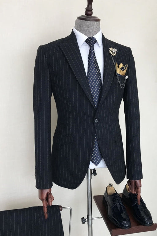 Button:One ButtonOccasion:Prom, Business, WeddingNeckline:Peaked LapelMaterial:Polyester BlendPattern:StripedPiece:2 PiecePocket:With Flap