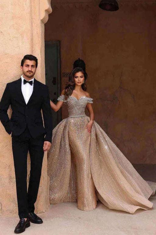 This elegant off-the-shoulder wedding dress features a luxurious satin finish and a flattering A-line silhouette that seamlessly transitions into a...