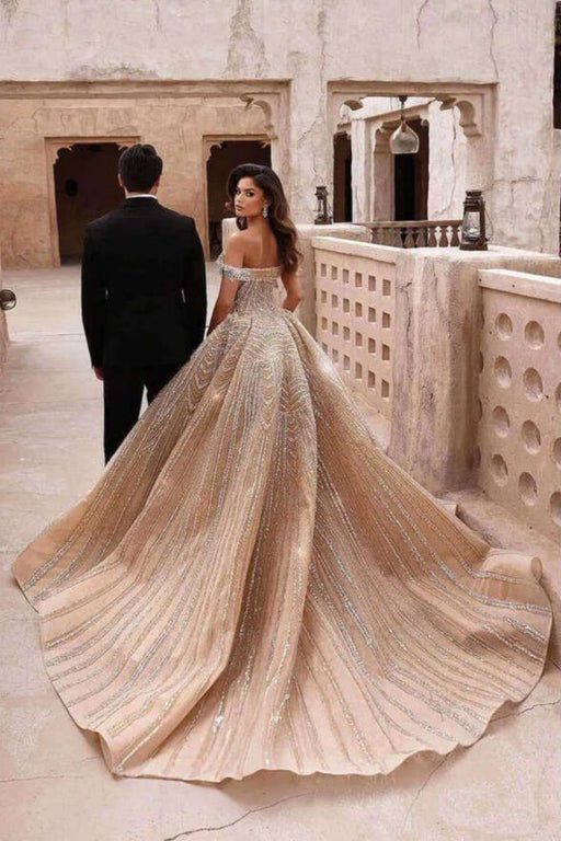 Elevate your bridal elegance with this plus size ball gown wedding dress featuring an off-the-shoulder neckline. Designed to flatter and embrace yo...