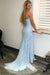 Light Sky Blue Mermaid Strapless Split Prom Dress With Lace Appliques