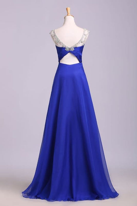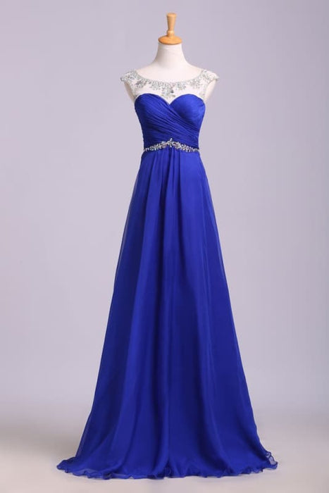 Royal Blue Floor Length Chiffon Prom Rhinestone Belt Evening Dress with Pleats