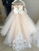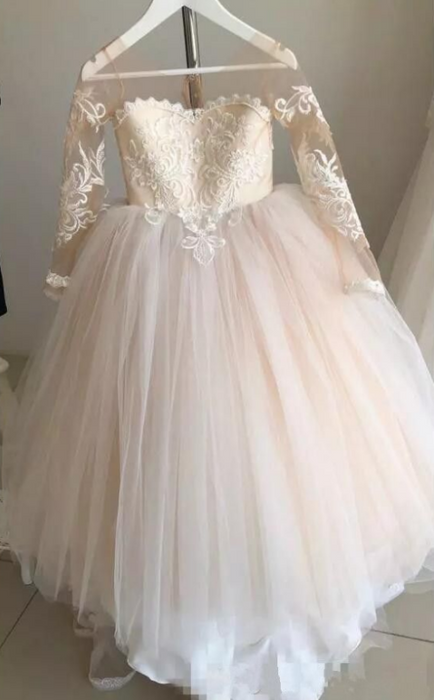 Crafted from luxurious tulle and adorned with intricate lace appliqués, this ball gown silhouette creates a fairytale moment your little one will cherish forever. The jewel neckline and long sleeves provide modest coverage while maintaining a sophisticated, princess-worthy aesthetic. The flowing full-length design ensures she'll look absolutely radiant as she walks down the aisle.