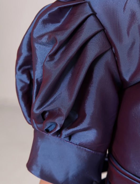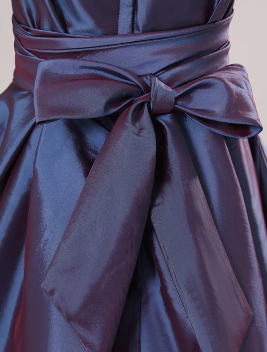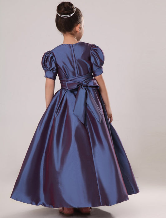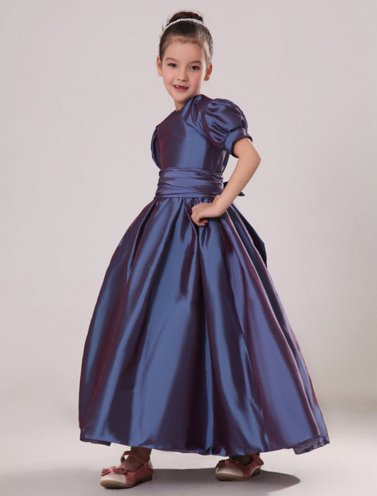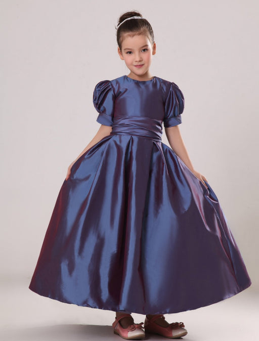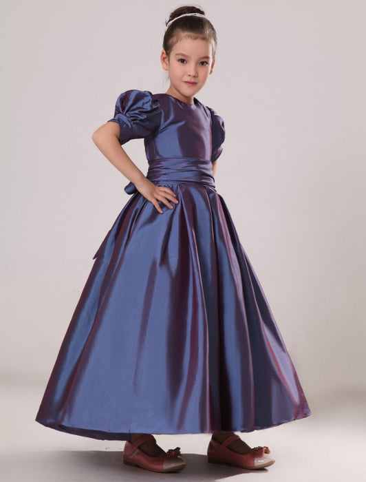 Purple Taffeta Ruched Flower Girl Dress Plum Toddlers Short Sleeve Princess Floor Length Kids Party Dress