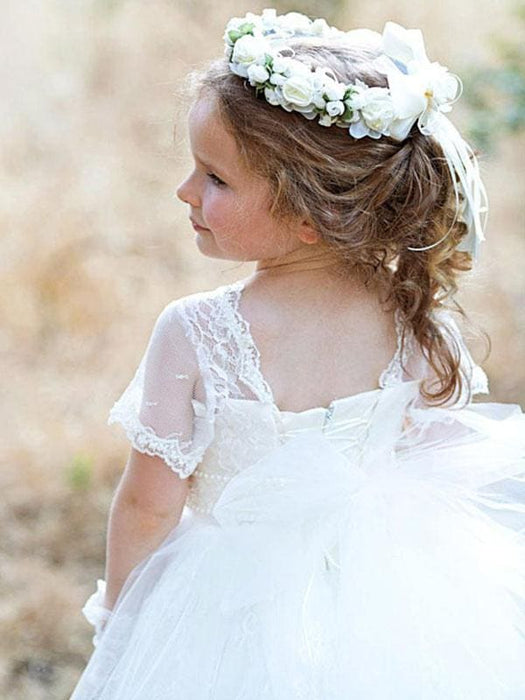 Tulle Short Sleeves Princess Flower Girl Dresses Jewel Neck Floor Length Formal Kids Pageant Dresses