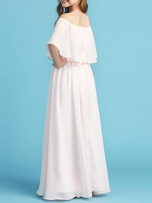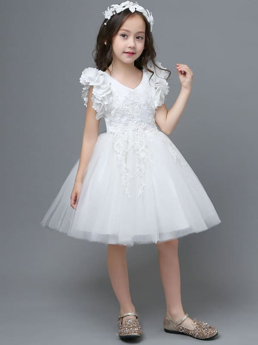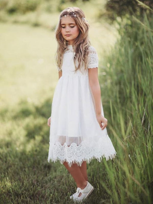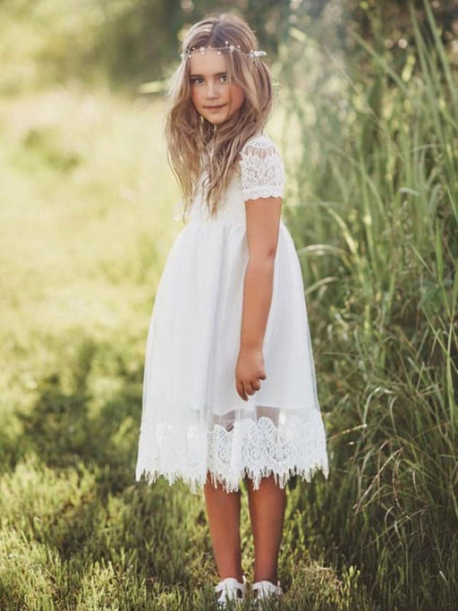 White V-Neck Lace Short Sleeves Flower Girl Dresses A-Line Applique Kids Formal Dresses
