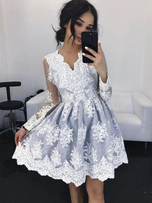 V Neck Long Sleeves Lace White Short Prom Homecoming, Long Sleeves White Lace Formal Graduation Evening