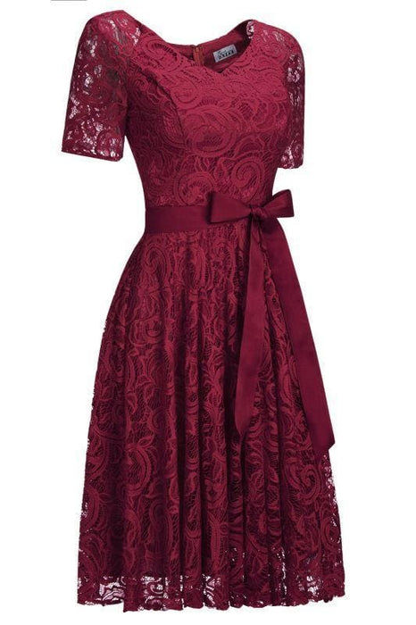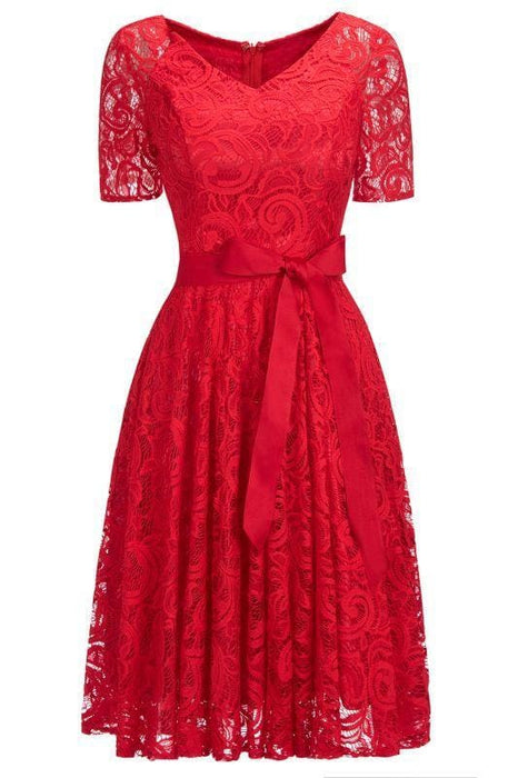 Bridelily Elegant V-neck Short Sleeves Lace Dresses with Bow Sash