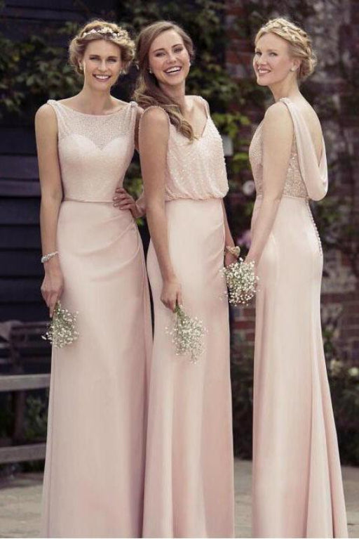 A-line Two Piece Peach Pink Jewel Sleeveless Open Back Floor-length Prom Dress