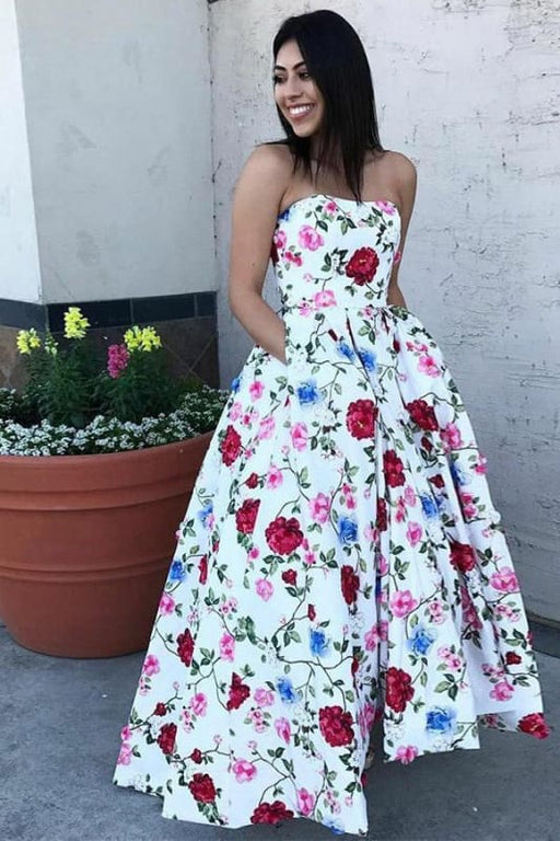 A-Line Strapless High Low White Printed Prom with Pockets Floral Party Dress