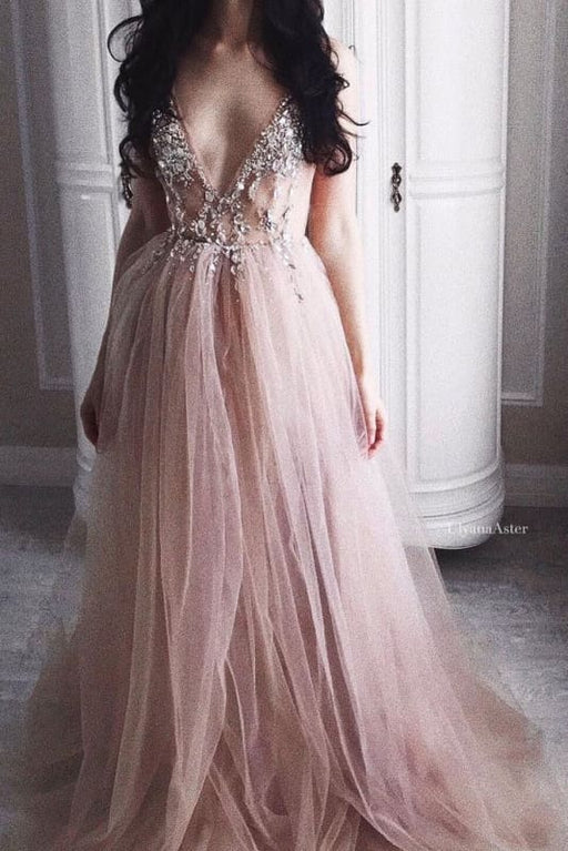 A-line V neck Tulle Appliques Prom Dresses Long with Beads Party Dress