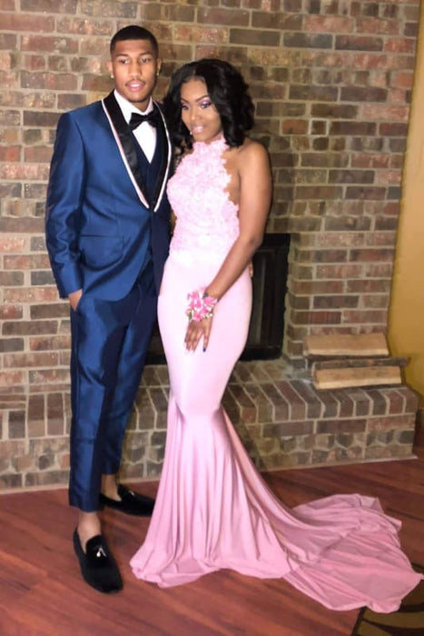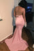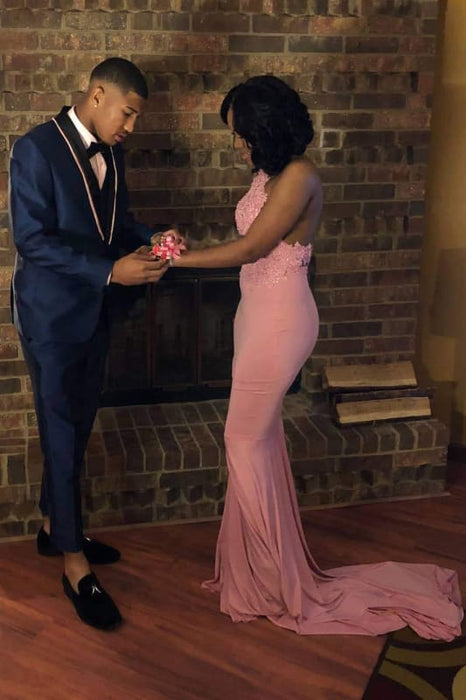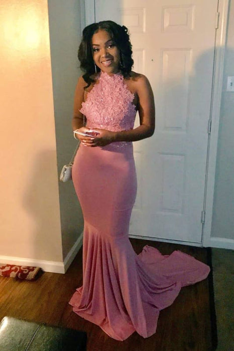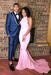 Attractive Pink Halter Backless Long Mermaid Prom Dresses with Train