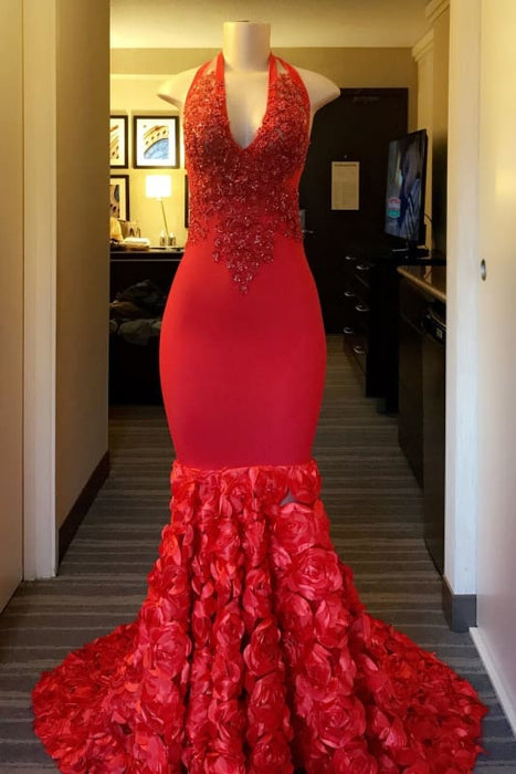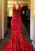 Red Floral Halter Lace Sequins Mermaid Prom Dresses