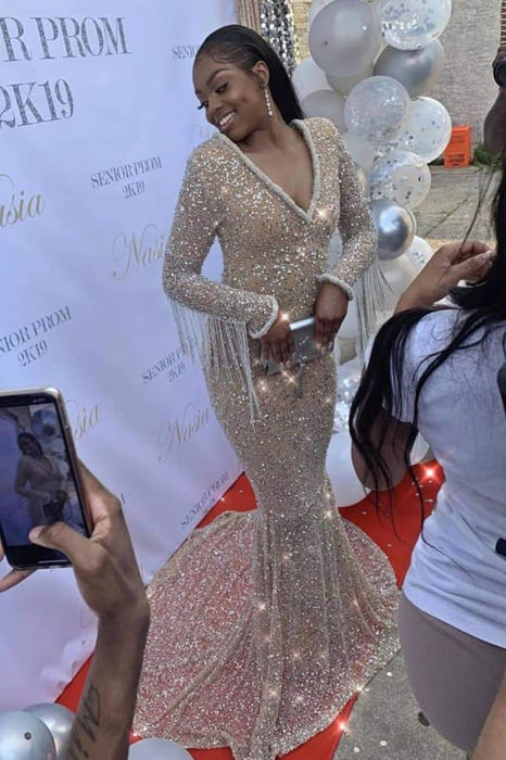 Sparking Shiny V-Neck Long Sleeves Mermaid Prom Dresses