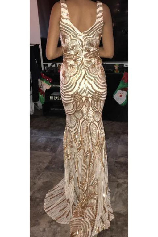 Key Features:1. Silhouette: Mermaid2. Fabric: Sequin3. Neckline: V-Neck4. Hemline/Train: Floor Length5. Sleeve Length: Sleeveless6. Waistline: Natu...
