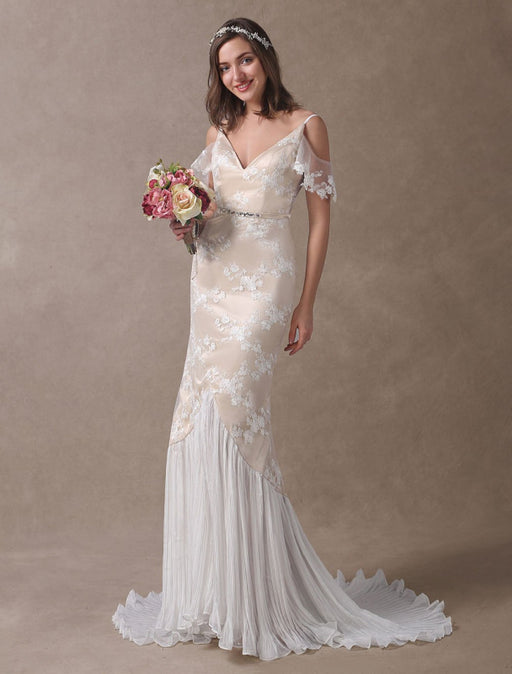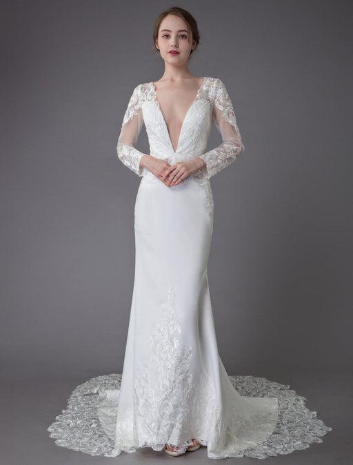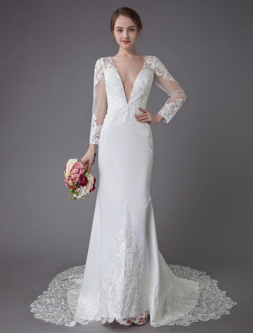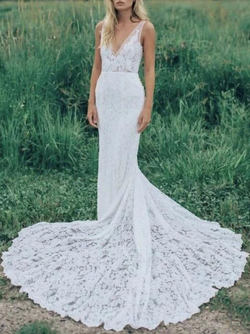 Simple Wedding Dress With Train Mermaid Dress V Neck Sleeveless Lace Bridal Dresses