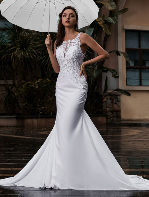 Mermaid Wedding Dress Jewel Neck Sleeveless Lace Bridal Dress With Train