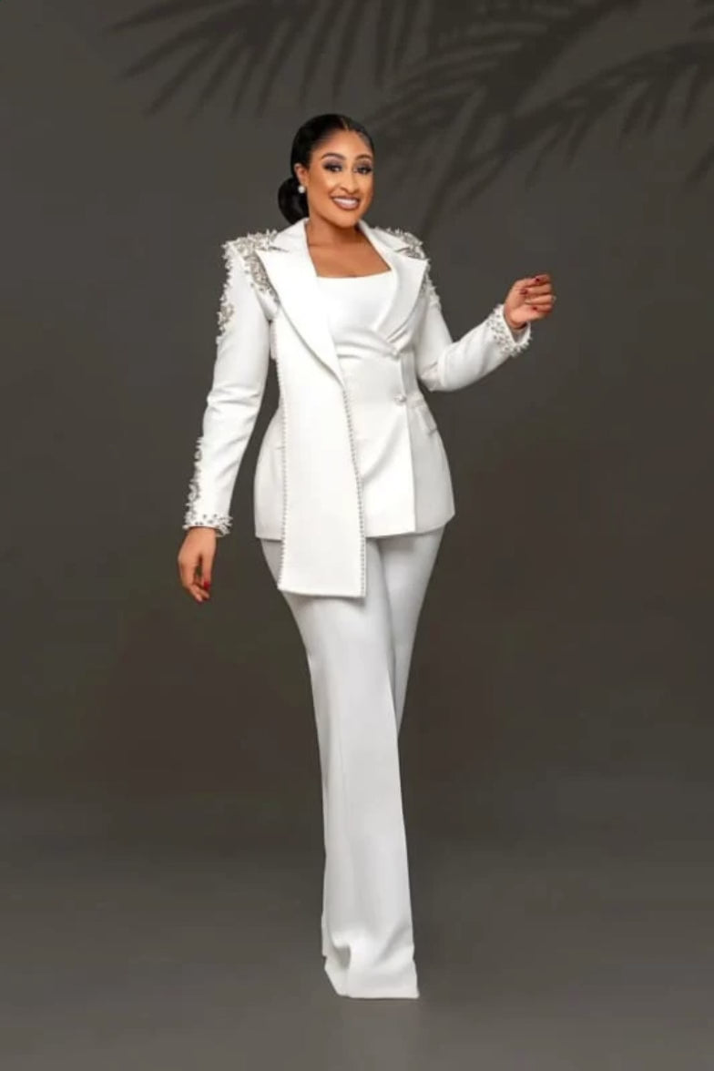 Unlike ordinary formalwear, this suit features carefully placed pearl embellishments that catch the light beautifully in photographs and candlelight. The peaked lapel creates a flattering vertical line, while the tailored pants offer both comfort and elegance for all-day wear. Whether you're walking down the aisle as mother of the bride, attending a gala, or celebrating at a formal event, this ensemble ensures you look and feel extraordinary.