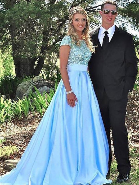 Bateau Short Sleeves Aline Satin Ball Gown Prom Dresses With Beading