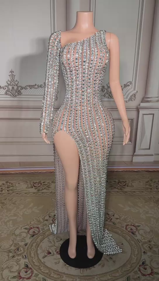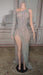 One Shoulder Crystals Floor Length Sheath Prom Dress with Long Sleeves