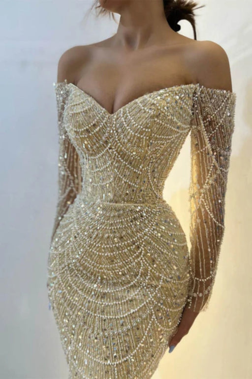 Neckline: Off-the-ShoulderSilhouette: Trumpet/MermaidBuilt-in Bra: YesSleeve: Long SleevesWaist: NaturalBack Style: OtherHemline/Train: Sweep/Brush...