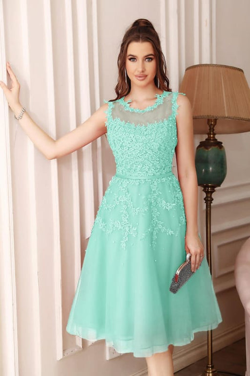 View full detailsThis green lace dress features a classic A-line silhouette with simple cap sleeves, offering a flattering fit for various body types. Its tea-lengt...