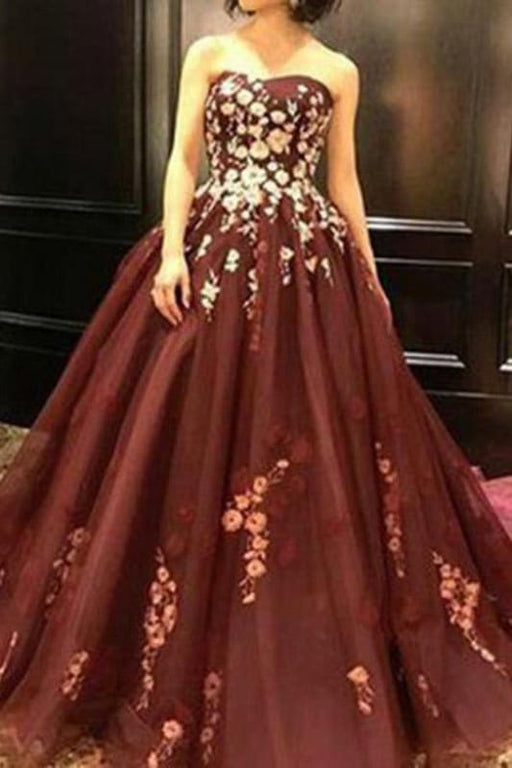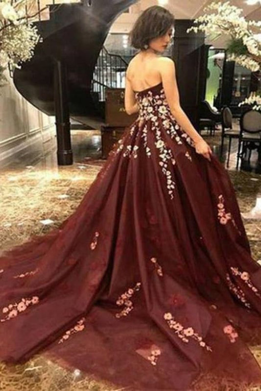 Long Sleeve Ball Gowns Red Stain Prom Dresses with Appliques Wedding Party Dress