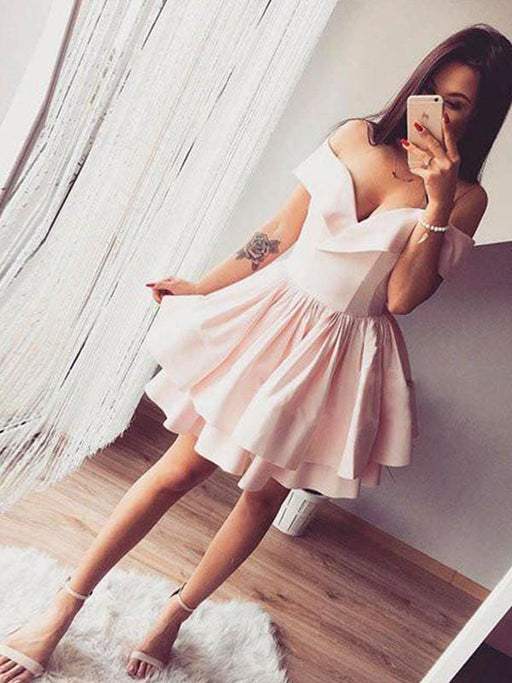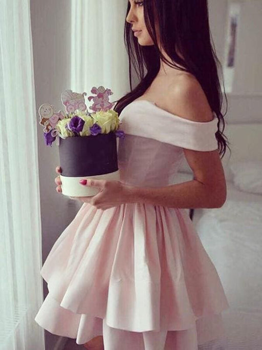 Bridelily A-Line Ruched Satin Off-the-Shoulder Knee-length Cocktail Dresses
