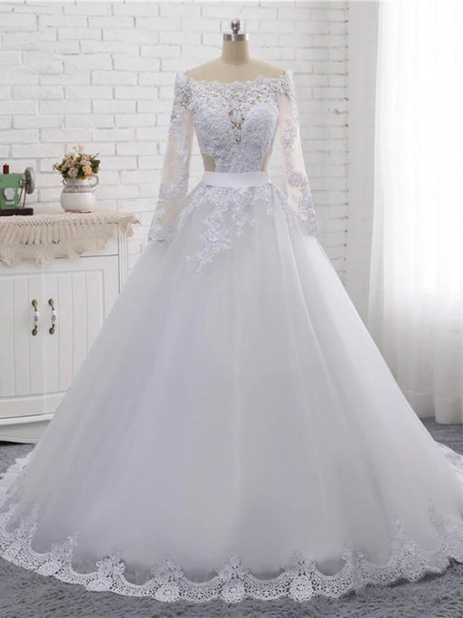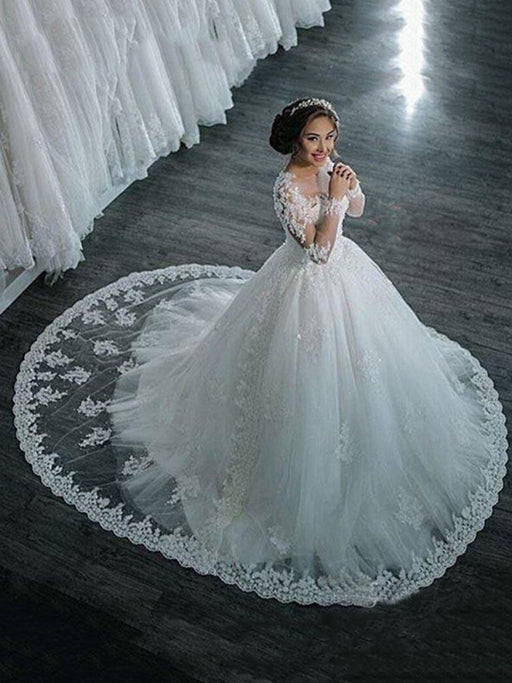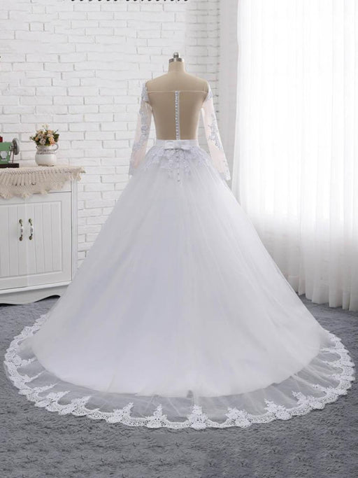 O-Neck Long Sleeves Lace-Up Ball Gown Wedding Dresses with Train