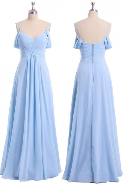 Make an unforgettable entrance in this ethereal light blue homecoming dress. The romantic off-shoulder neckline frames your décolletage beautifully, while the flowing chiffon fabric creates effortless movement with every step.