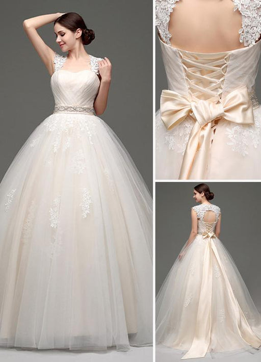 Tulle Cap Sleeves Keyhole Back Princess Wedding Dress With Bow And Rhinestone Sash