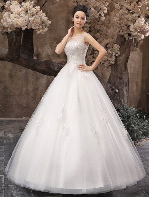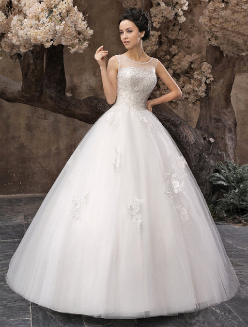 White Ball Gown Jewel Neck Beading Floor-Length Bridal Wedding Dress