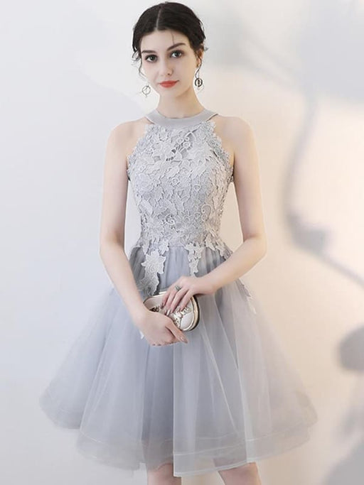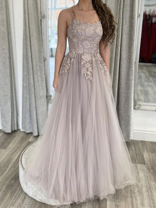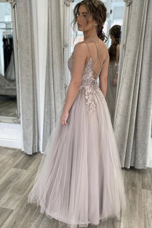A Line Silver Grey Lace Long Prom, Silver Grey Lace Formal Graduation Evening