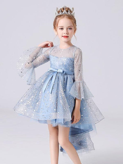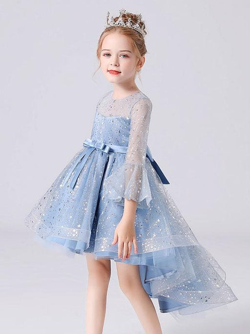 Blue Hi-Lo Flower Girl Dresses Jewel Neck 3/4 Puffy Sleevess Formal Kids Pageant Dresses