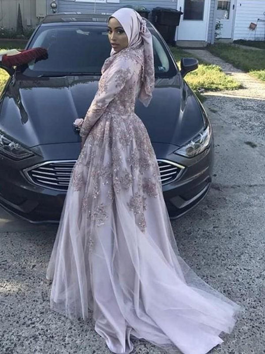 Sleeves Scoop Sweep/Brush Train With Applique Tulle Muslim Dresses