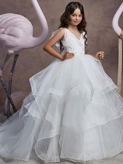 Elegant Purple Flower Girl Dresses V-Neck Sleeveless Tulle Lace Kids Party Dresses