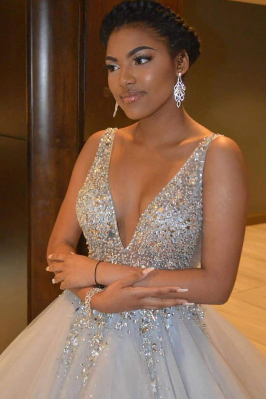 Gorgeous Spaghetti Strap Rhinestone Sleeveless Ball Gown Prom Dresses