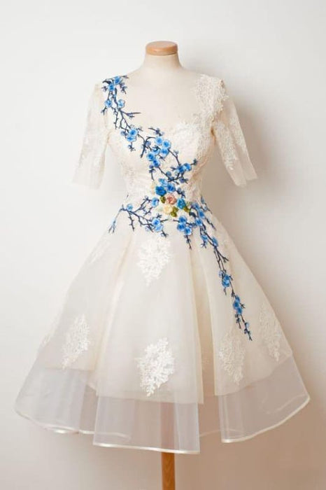 Ivory Half Sleeves A Line Homecoming with Blue Appliques Knee Length Prom Dress