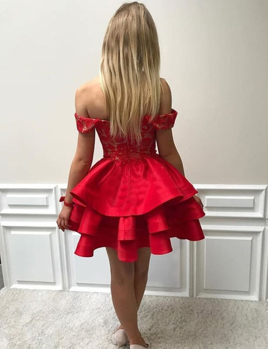 Sexy A-Line Off-The-Shoulder Red Tiered Homecoming With Lace Short Prom Dress