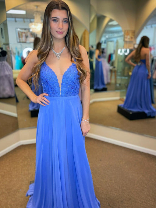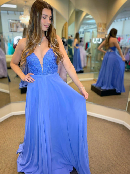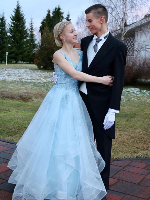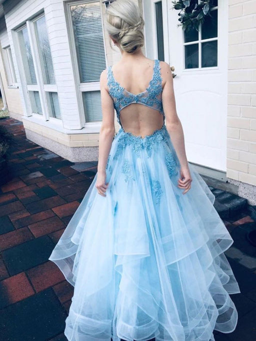 V Neck Open Back Light Blue Lace Long Prom, Light Blue Lace Formal Graduation Evening