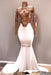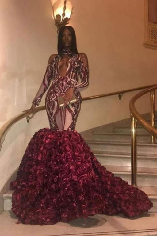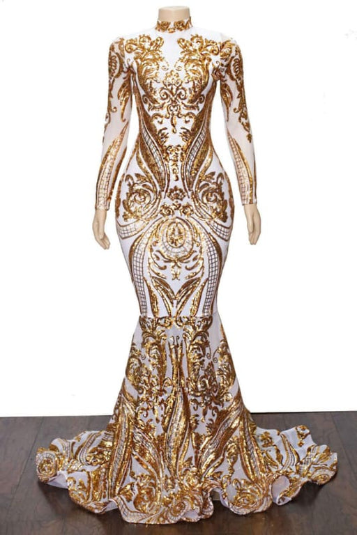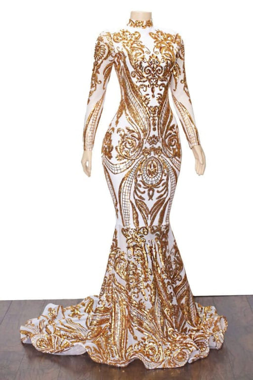 White High Neck Long Sleeve Gold Sequins Mermaid Prom Dress
