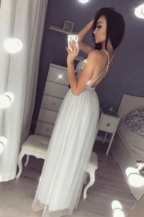A Line V Neck Sequined Party Silver Spaghetti Straps Sleeveless Tulle Prom Dress