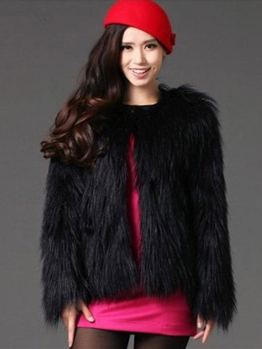 Black Winter Coat Faux Fur Round Collar Women'S Fluffy Coat And Jacket