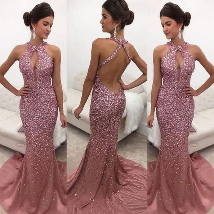 Bridelily Halter Sleeveless Backless Sweep-train Sequins Mermaid Evening Dresses
