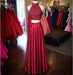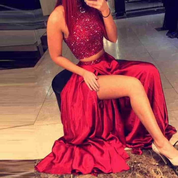 Bridelily Red Two Pieces Prom Dresses 2019 High Neck Beaded Thigh-High Slit Sexy Evening Gowns