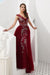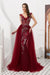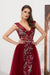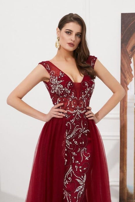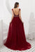 Burgundy V Neck Sleeveless Tulle Long Prom Dress with Beads Crystal