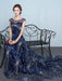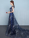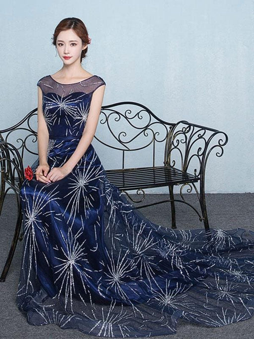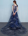 Constellation Dress Dark Navy Evening Dress 2021 Sexy A Line Scoop Neck Sequin Star Tulle Formal Party Dresses With Train