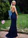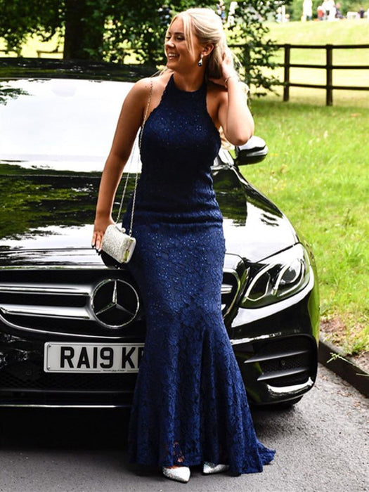 Elegant Halter Neck Backless Mermaid Blue Lace Long Prom, Mermaid Blue Lace Formal Graduation Evening