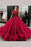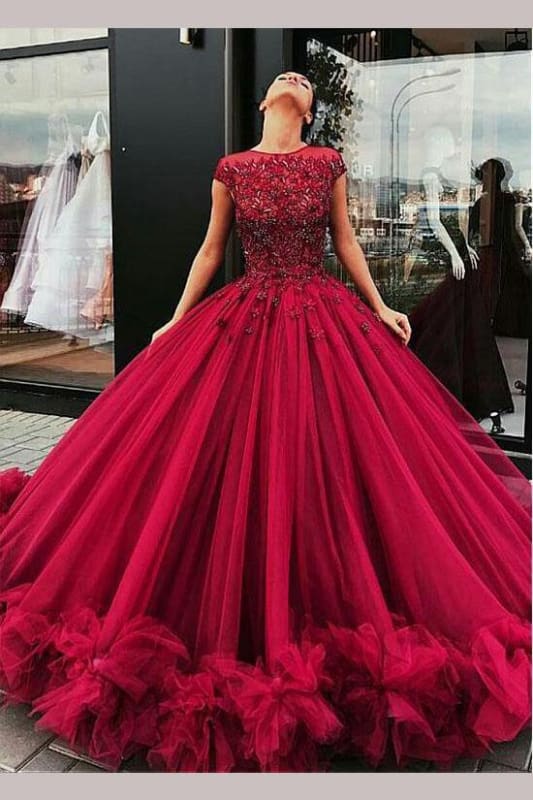 Gorgeous Burgundy Ball Gown Jewel Tulle Beading Cap Sleeves Prom Dress
